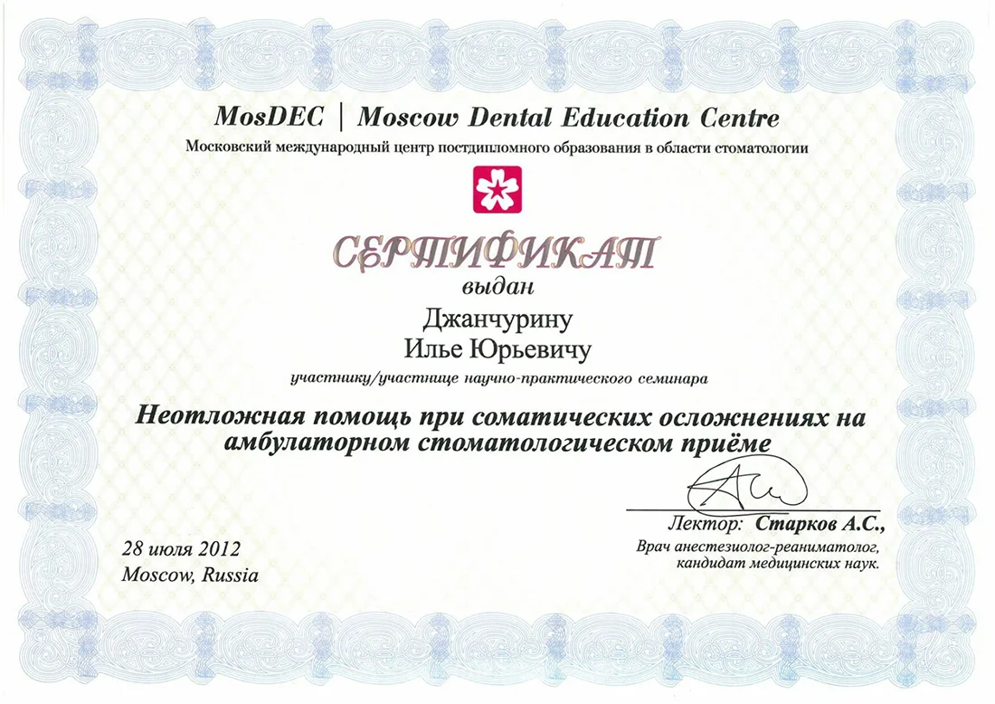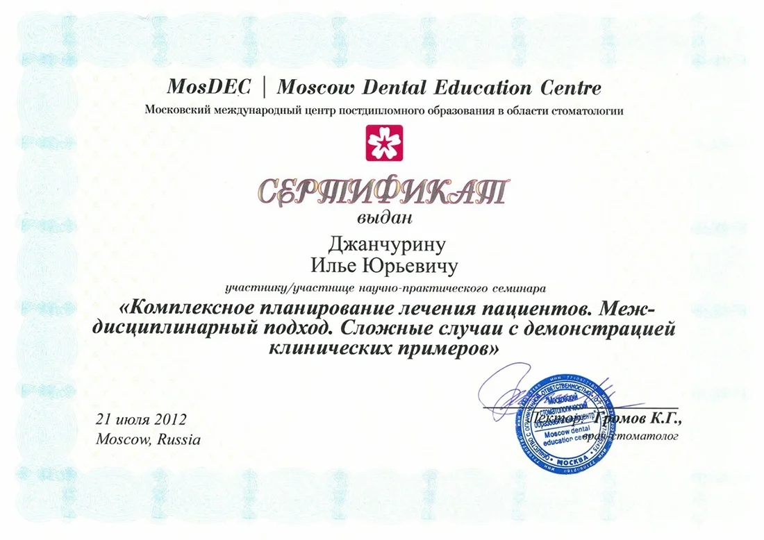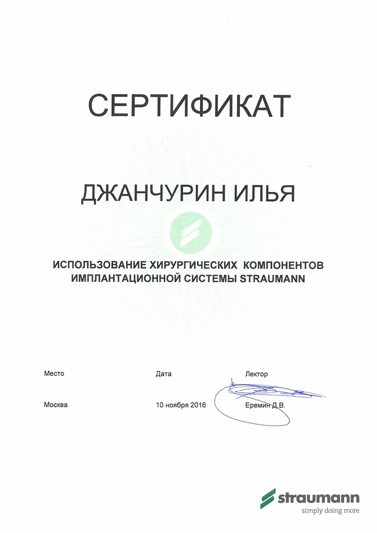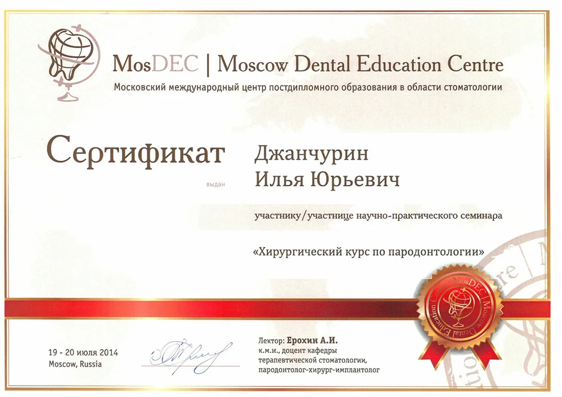 Прогрессивный специалист, который проходил обучение у ведущих экспертов в области хирургической стоматологии, а также дентальной имплантации, в том числе с немедленной нагрузкой протезом.