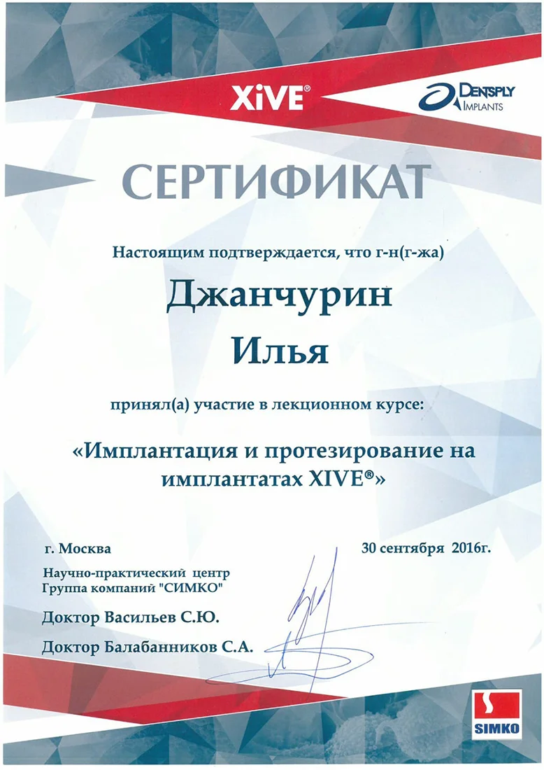 Прошел обучение и активно применяет на практике передовые системы имплантов и такие протоколы лечения, как all-on-4 и all-on-6, в том числе с установкой протеза в день операции.