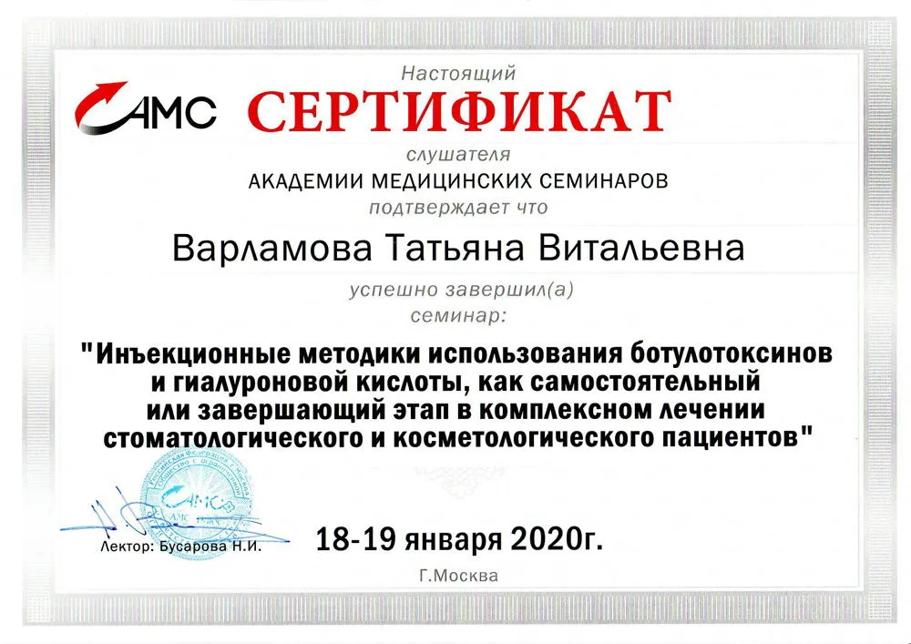Проводит лечение гингивита и пародонтита начальной стадии, применяя для восстановления состояния десен гиалуроновую кислоту и ботокс.